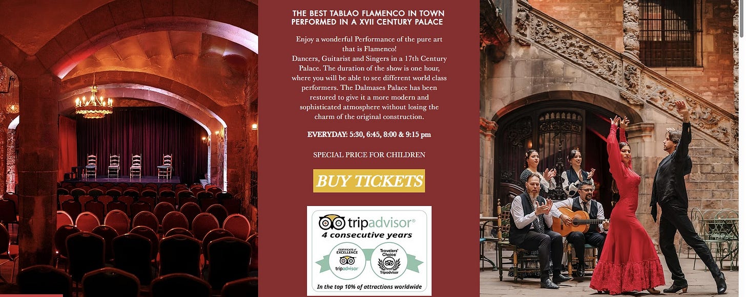 And, at this point, I should acknowledge that I’m really not the guy to give insightful analysis into finding the proper flamenco experience for you. I love flamenco and appreciate the artistry and all that but, full disclosure, I have no idea which show best captures the authentic flamenco legends with the most talented performers in the best venue. Anybody who says they can rate the shows is probably selling you something. Your interests, goals and schedules will vary.