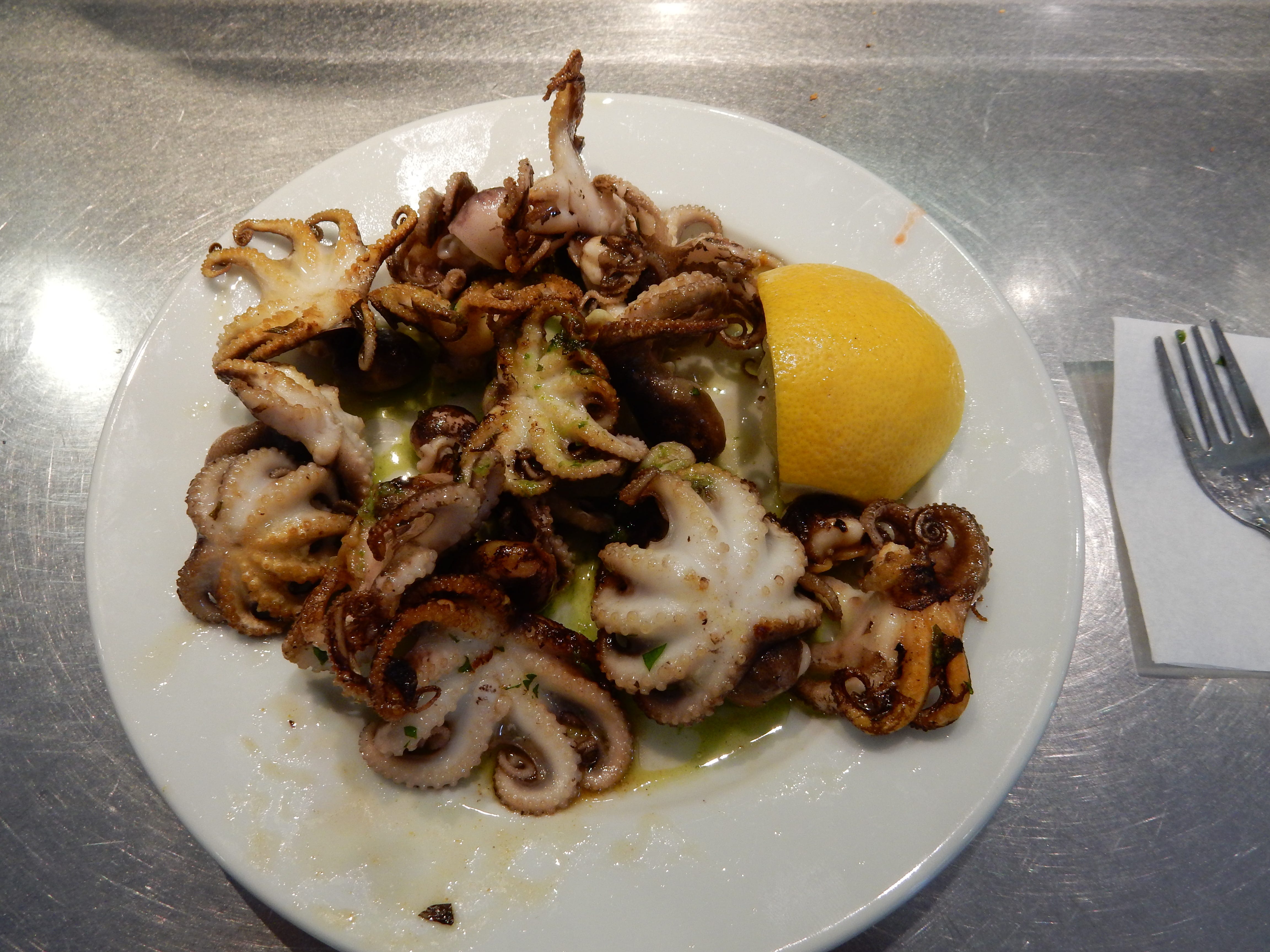 There is nothing fancy about Bar Celta. The waiters may or may not be friendly. I like it’s complete lack of charm. The signature offering is pulpo a feira, which is octopus boiled octopus served with olive oil and maybe a sprinkle or salt or paprika. You can’t go wrong with the pulpo a feira and fresh bread, with a lemon to squeeze over the top. There are variations in the presentation, but each dish is fresh and flavorful, presented in the simple style. Octopus is the headliner, but they offer a full array of traditional tapas, including squid, various parts of pig and Padrón peppers, as well as other fresh seafood. The cockles and mussels are always good, but I wouldn’t stray too far from the pulpo, which is the attraction. (And, personally, I would avoid the fried items.)